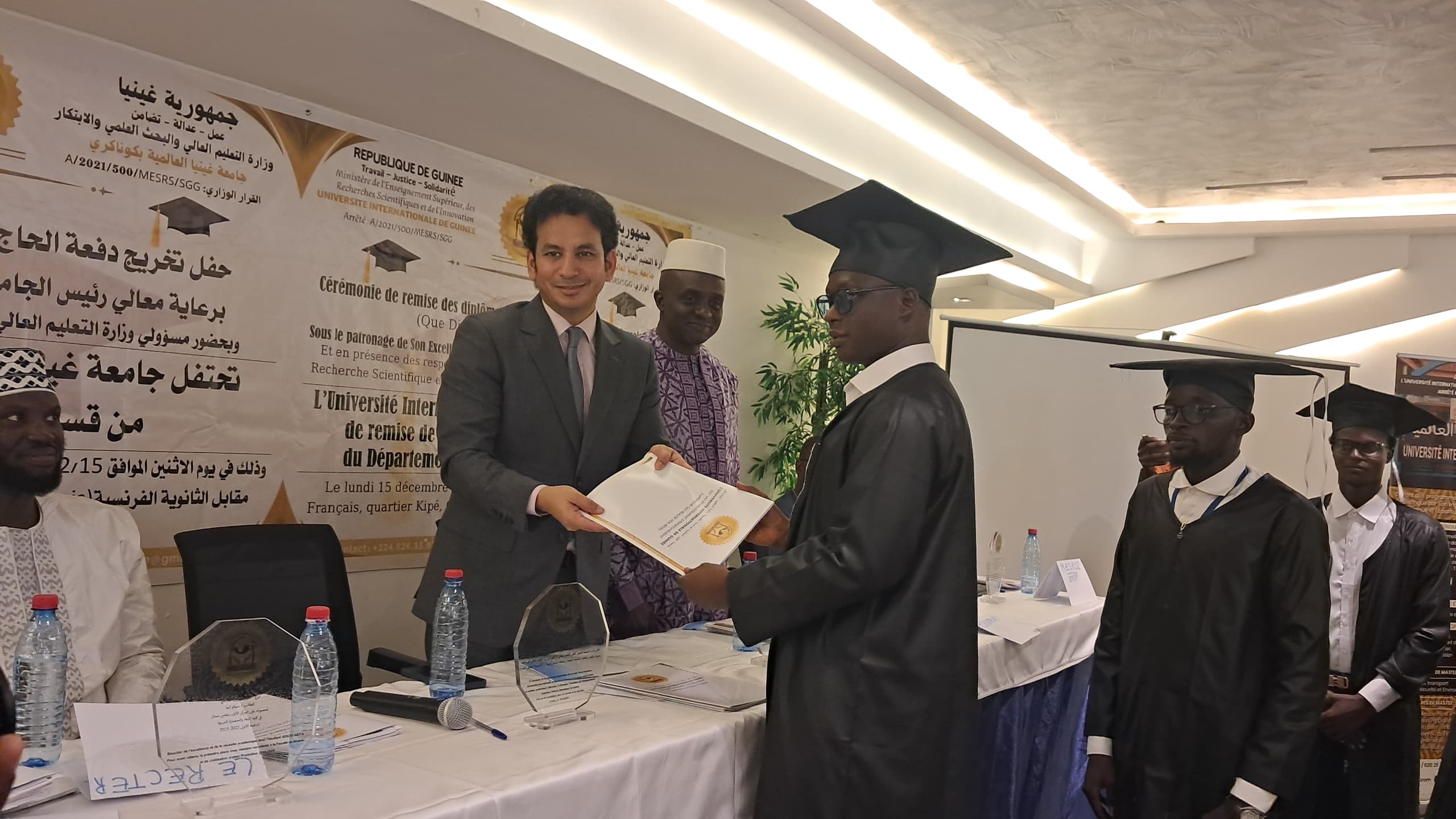 حظي الحفل برعاية وتشريف رئيس جامعة غينيا العالمية، الدكتور سليمان أحمد نيانغادو، الذي أكد في كلمته دور الجامعة في تعزيز منظومة التعليم العربي والإسلامي، ودعم البحث العلمي، وتخريج كوادر قادرة على الإسهام الفعّال في بناء المجتمع الغيني.